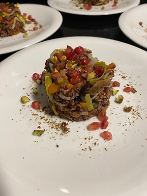 Un plato vegetal de sabor profundo y contraste delicado. El arroz rojo aporta textura y carácter, los pistachos añaden un crujiente suave y la granada introduce un frescor ligero que equilibra el conjunto. Una combinación sencilla y festiva, pensada para disfrutar con calma.